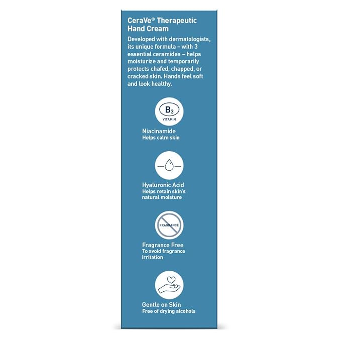 CeraVe Therapeutic Hand Cream for Dry Cracked Hands With Hyaluronic Acid and Niacinamide, Fragrance Free 3 Ounce